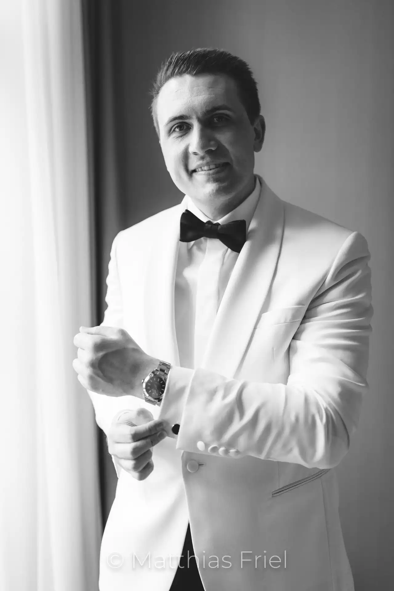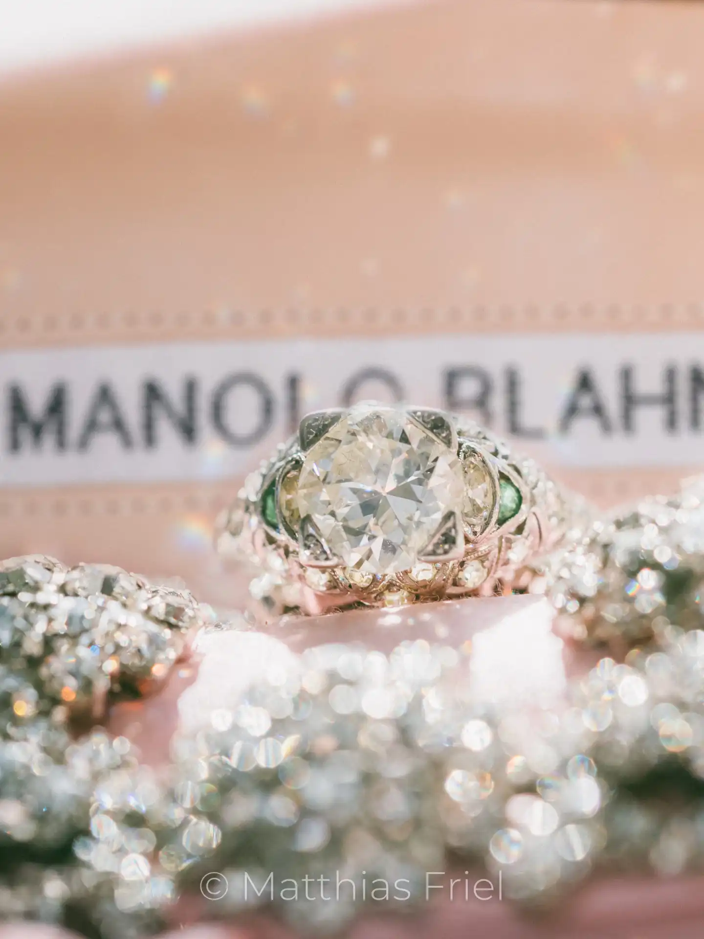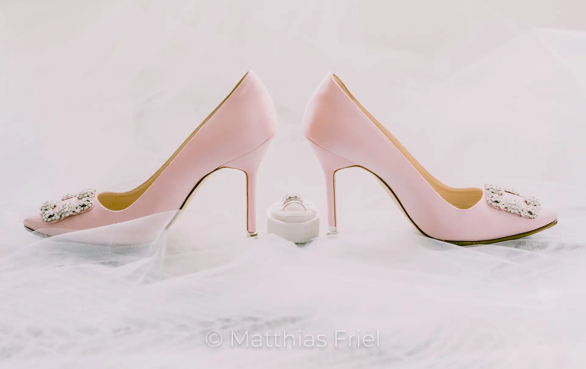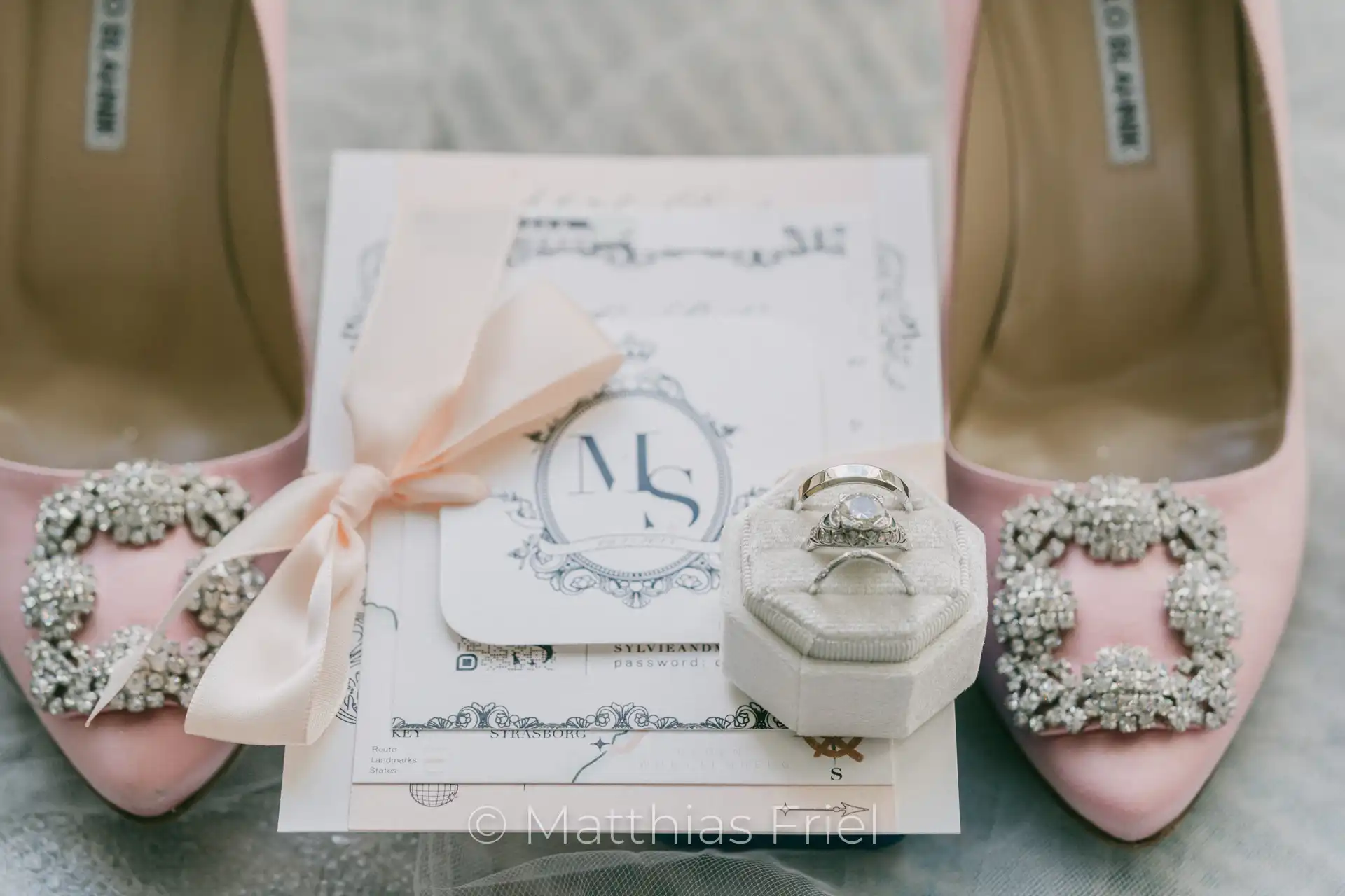 Bevor der Tag beginnt, liegt er still auf einem Tisch. Die Einladung, monatelang vorbereitet, jetzt herausgeholt ein letztes Mal. Die Ringe, die noch warten. Sylvies Schuhe — Manolo Blahnik, für diesen Tag ausgesucht. Ich fotografiere diese Details als Layflat: flach, ruhig, jedes Stück mit dem Platz, den es verdient. Diese Bilder entstehen, bevor die Energie des Tages alles in Bewegung setzt. Sie erzählen, was kein Zeremonienbild erzählen kann.