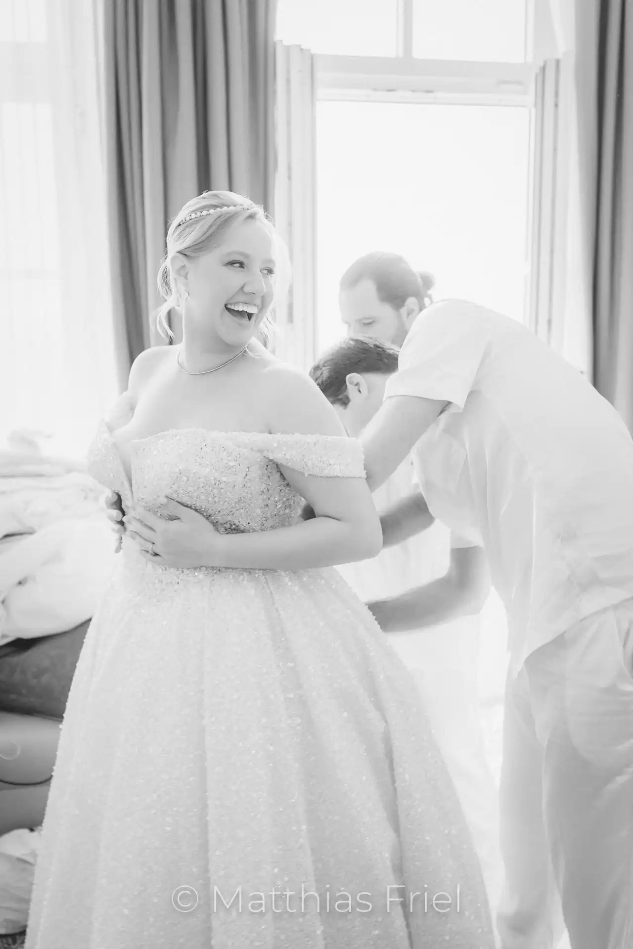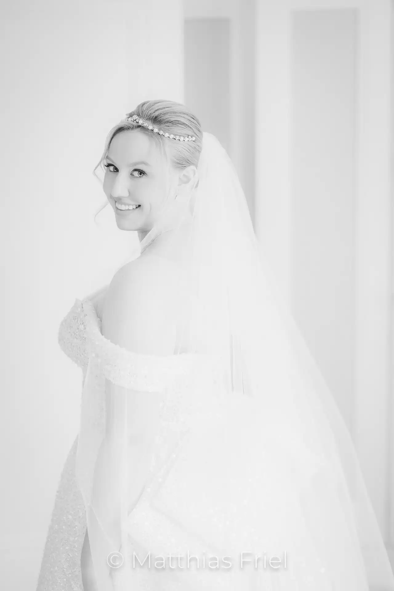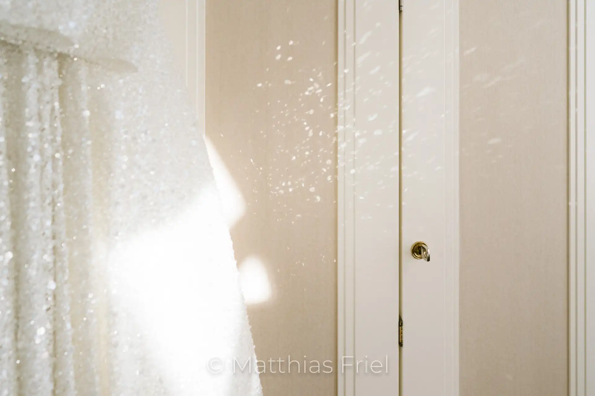 Die freie Trauung fand im Ballsaal statt. Hohe Decken, viel Licht, eine Akustik, die Worte trägt ohne sie zu verschlucken. Sylvie kam herein, und für einen Moment war der Raum still auf eine Weise, die ich in dieser Form selten erlebe. Nicht die aufgeregte Stille des Wartens — sondern die ruhige, schwere Stille der Aufmerksamkeit. Alle sahen hin. Alle hörten zu.
