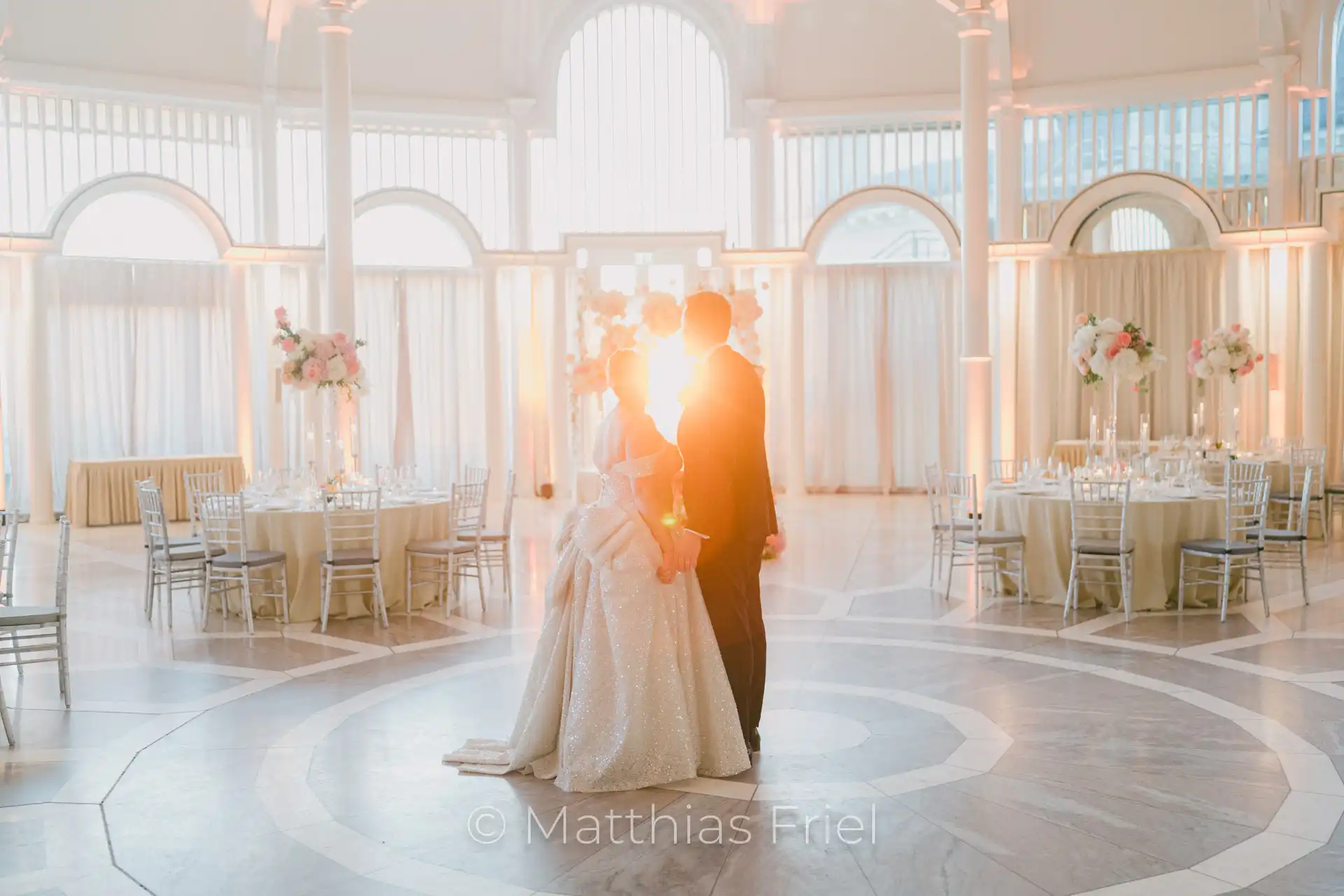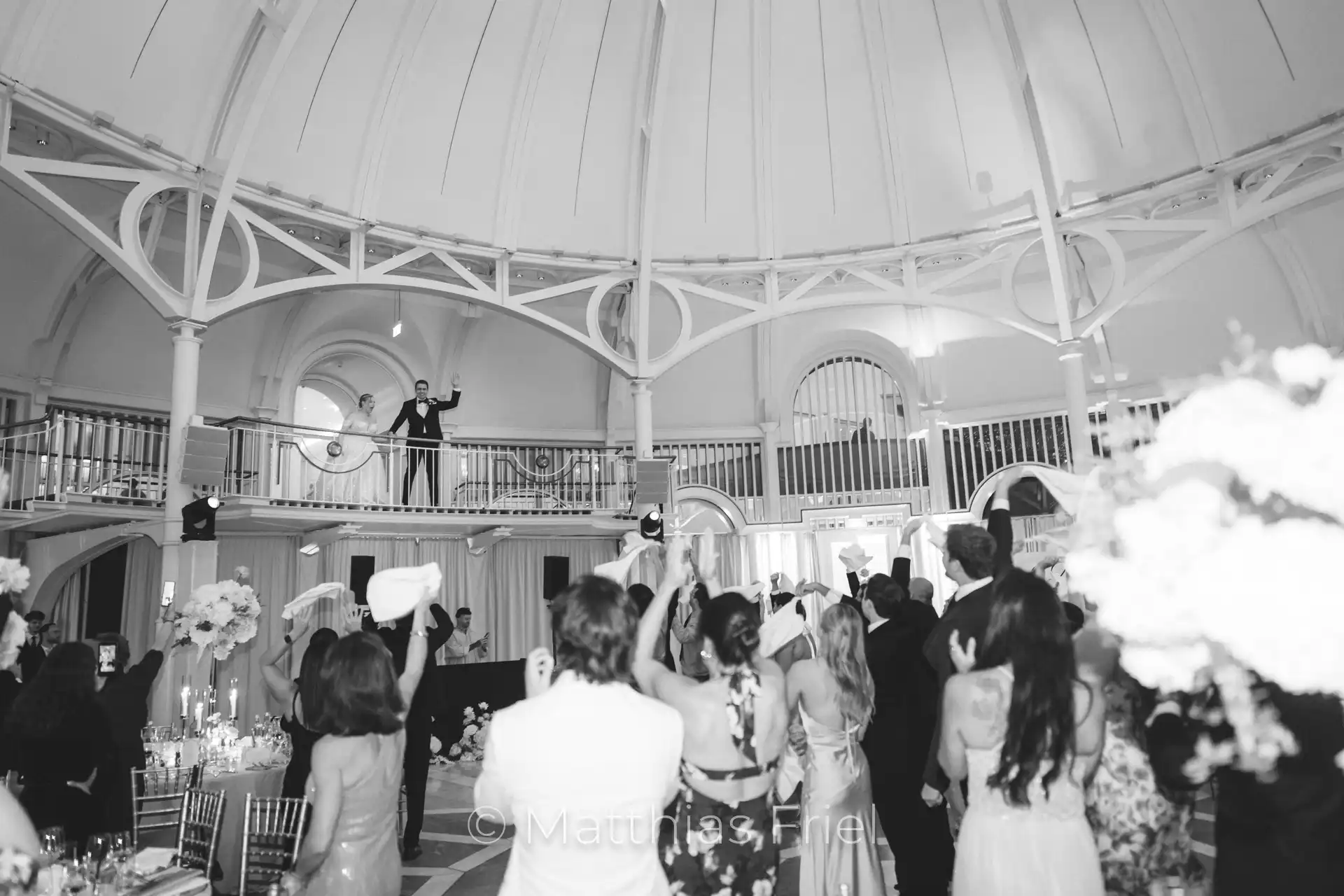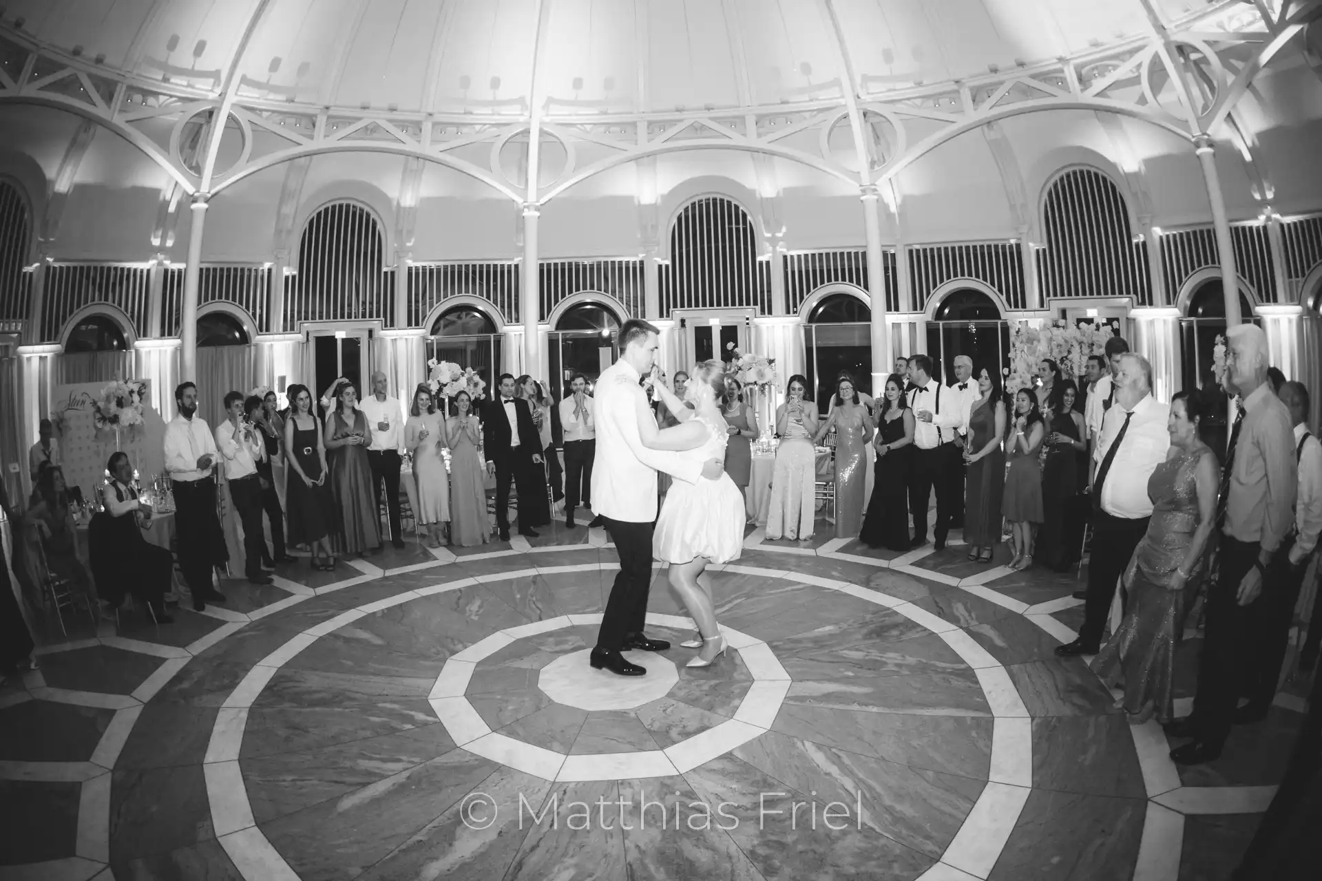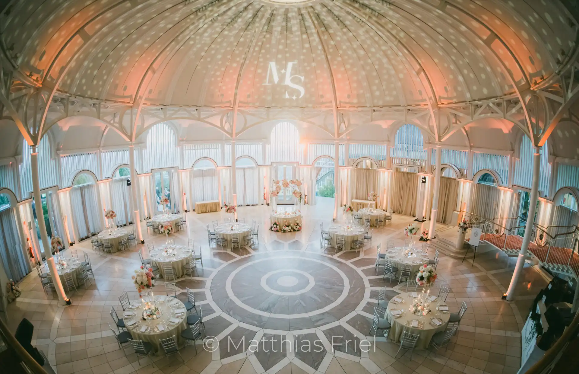 Nach der Trauung im Ballsaal wechselte der Tag den Raum: Dinner und Party fanden in der Rotunde statt. Eine andere Geometrie, eine andere Lichtstimmung — aber dieselbe Energie. Den DJ hatten Sylvie und Max aus den USA einfliegen lassen. Was das bedeutet, versteht man, wenn man die Tanzfläche sieht: voller Einsatz, von der ersten Minute bis spät in die Nacht. Musik, die beide Seiten kennen. Beats, die keine Übersetzung brauchen.