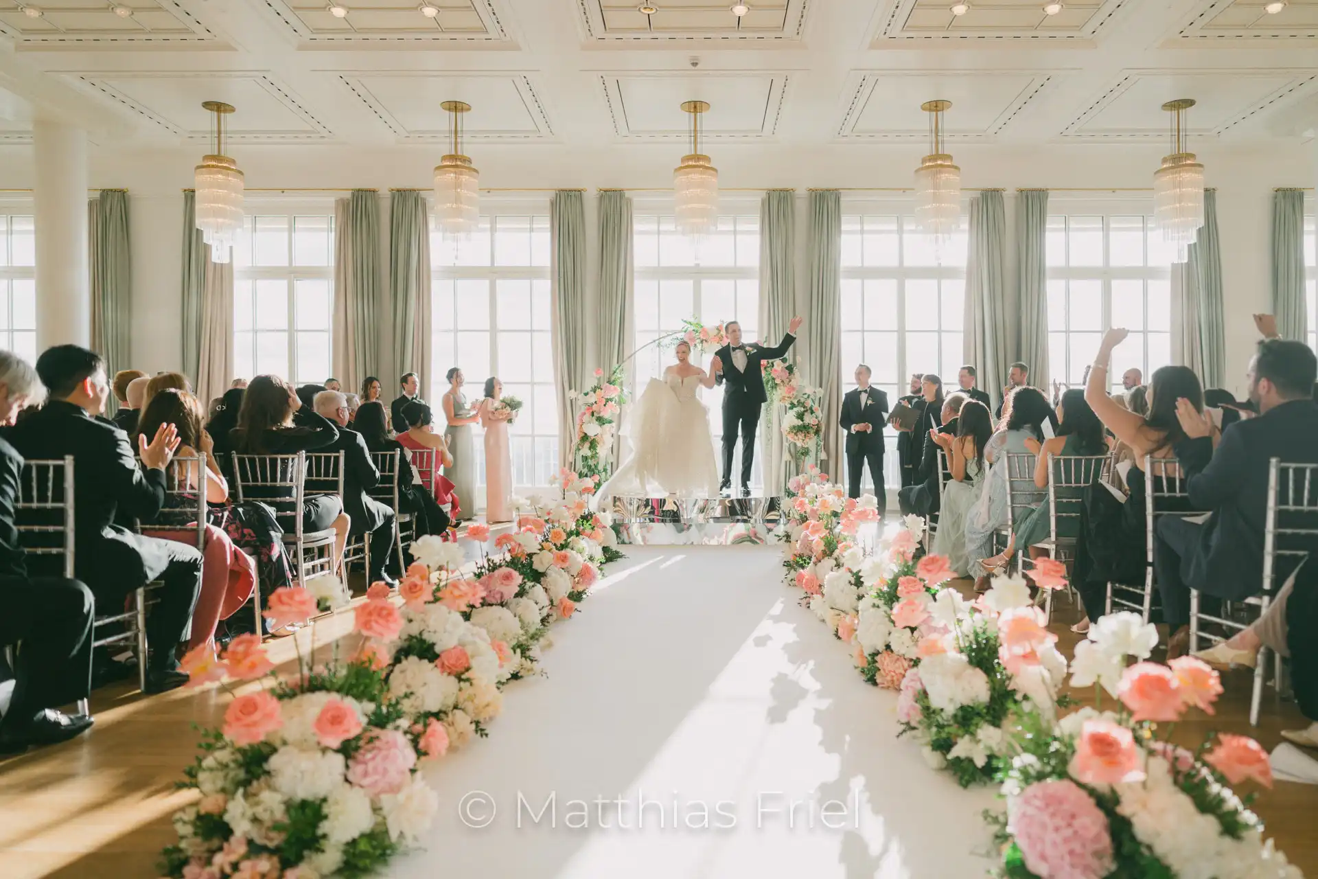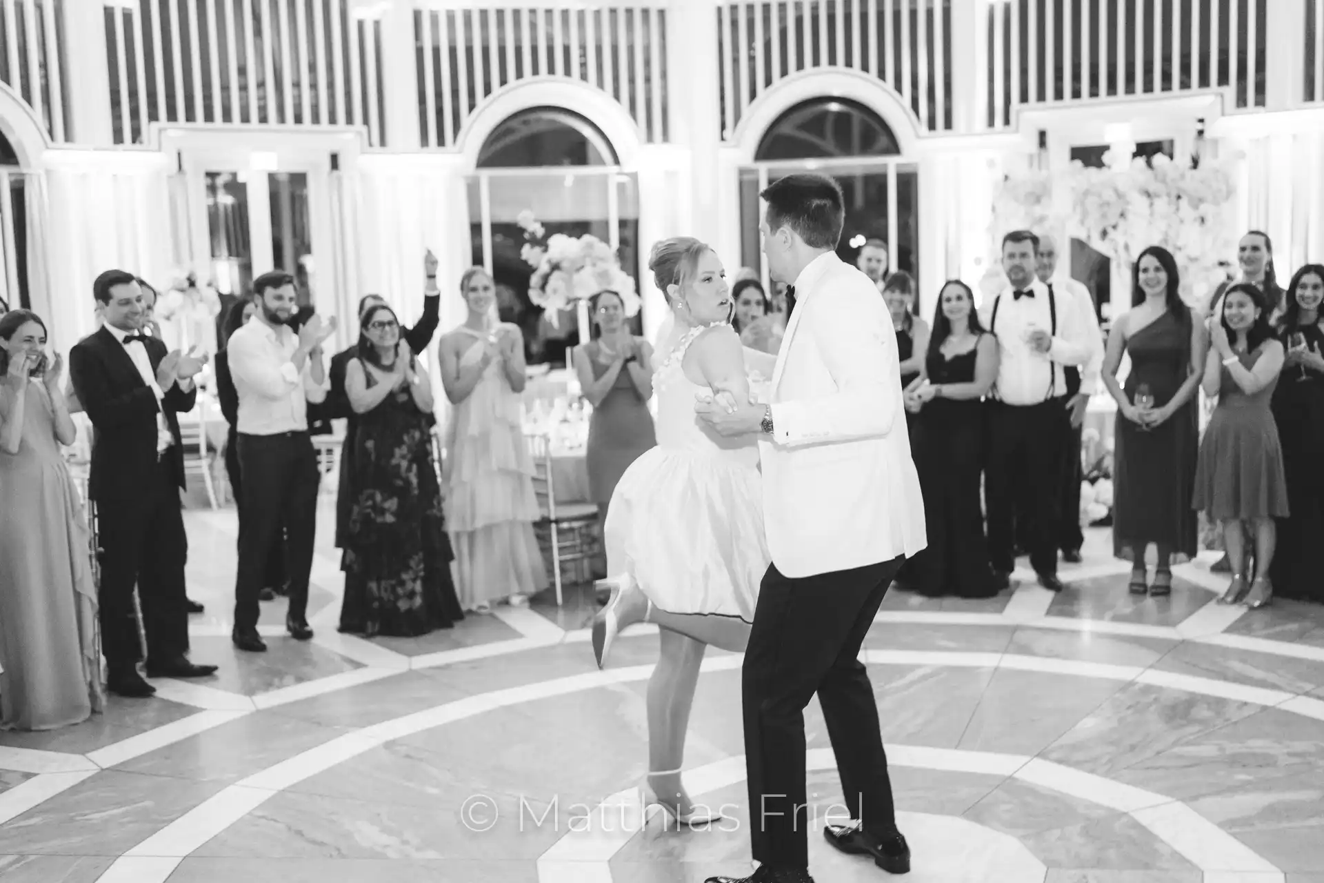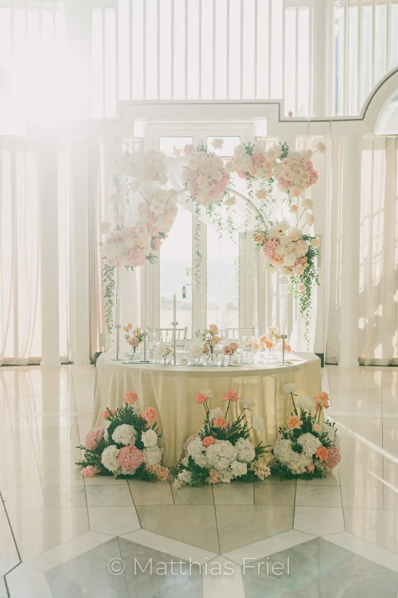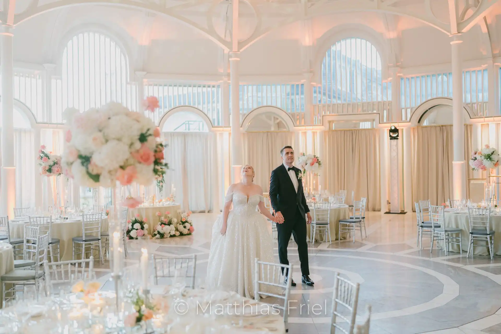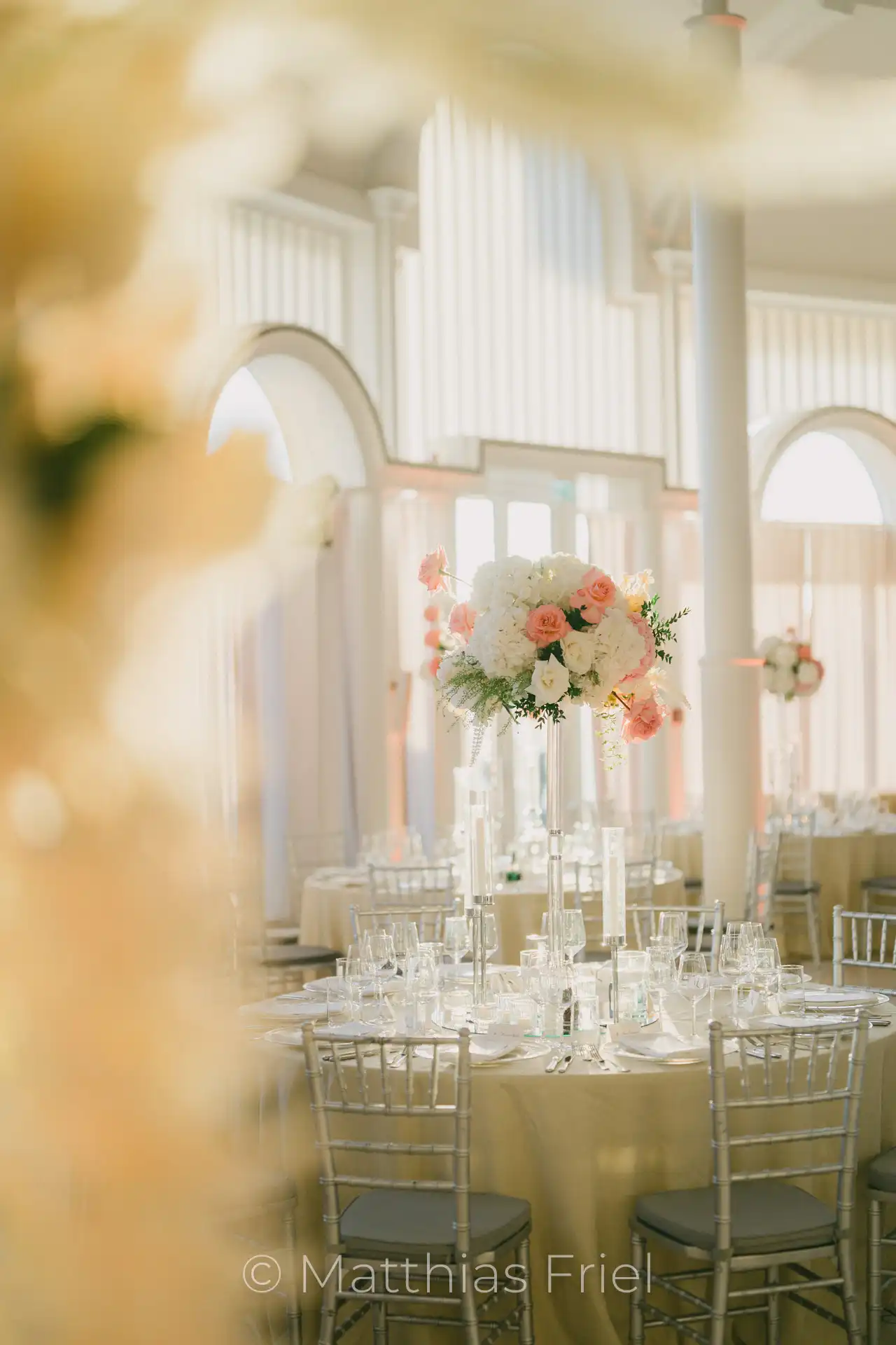 Nach der Trauung im Ballsaal wechselte der Tag den Raum: Dinner und Party fanden in der Rotunde statt. Eine andere Geometrie, eine andere Lichtstimmung — aber dieselbe Energie. Den DJ hatten Sylvie und Max aus den USA einfliegen lassen. Was das bedeutet, versteht man, wenn man die Tanzfläche sieht: voller Einsatz, von der ersten Minute bis spät in die Nacht. Musik, die beide Seiten kennen. Beats, die keine Übersetzung brauchen.